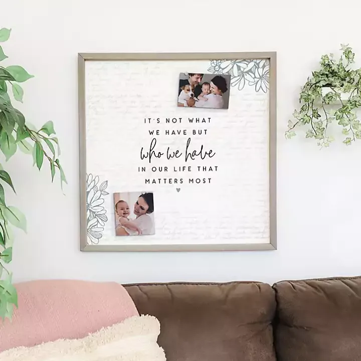 - Reads “It’s not what we have but who we have in our life that matters most” with floral details