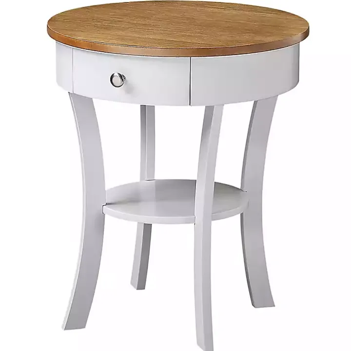 Incorporate stylish storage into your space with this Wood & White Curved Legs Round Drawer Accent Table! This sleek accent table has a drawer for storage and a lower shelf for displaying your favorite home decor.